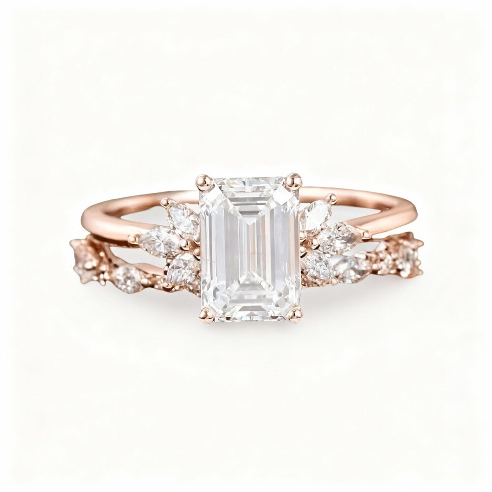 Discover the perfect symbol of love with our exquisite 10K Gold Bridal Set, designed for couples who desire elegance and uniqueness—featuring a brilliant emerald-cut Moissanite center stone that dazzles with a total weight ranging from 1 to 5 CT, complemented by shimmering side stones totaling 0.27 CT, all crafted in luxurious Rose Gold for a radiant finish.