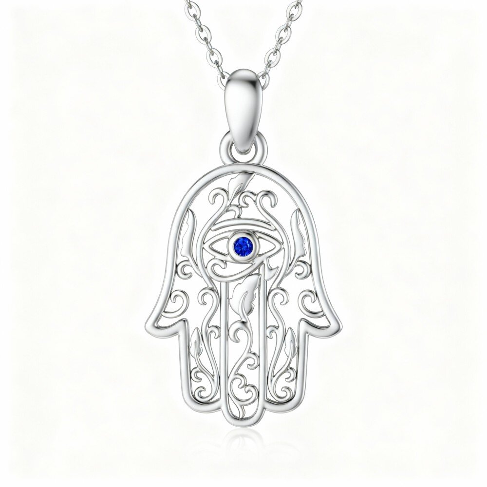 Discover our stunning 10K White Gold Pendant Necklace with beautiful Cubic Zirconia that showcases the protective Evil Eye and Hamsa Hand symbols.