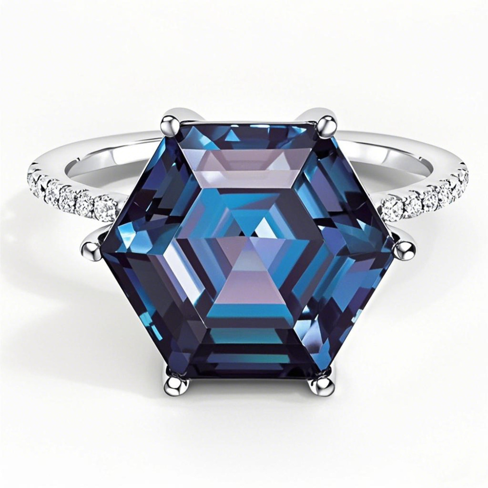 Elevate your love story with our exquisite custom 10K white gold engagement ring, showcasing a stunning large center alexandrite complemented by dazzling side moissanite stones for a total carat weight of 1.5 CT. T.W. Designed for the modern woman, this ring is not only a symbol of commitment but also a unique piece that reflects individuality and elegance.