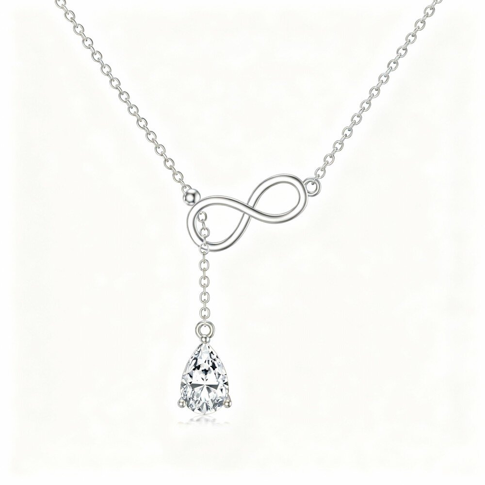 Explore the exquisite design of our 10K White Gold Adjustable Y Necklace, featuring a beautiful pear-shaped pendant and an infinity symbol for timeless elegance.