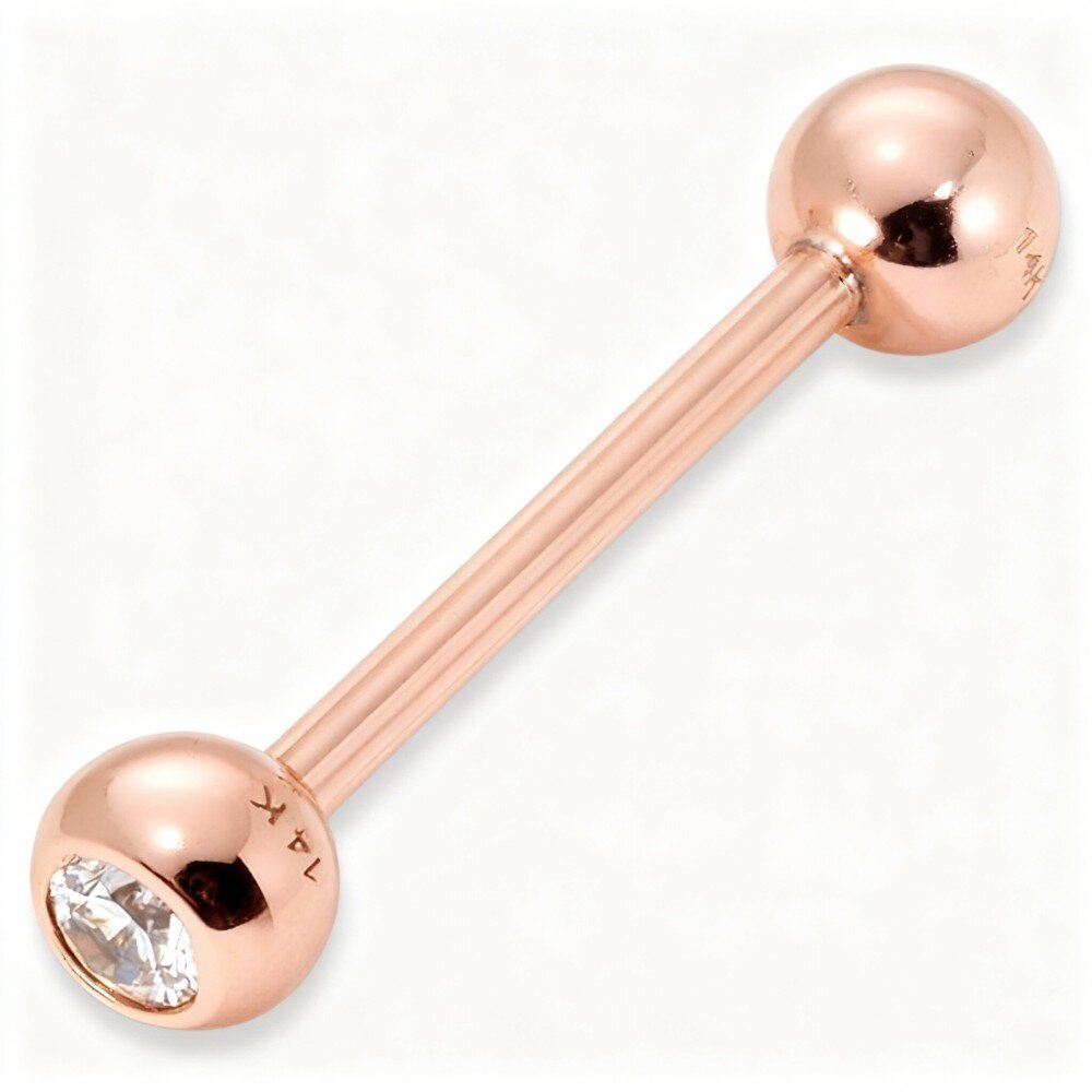 Elevate your accessory game with our stunning unisex tongue jewelry, crafted from premium 14K Rose Gold and adorned with brilliant moissanite gemstones. Featuring a sleek bar design, this exquisite piece offers a luxurious look and exceptional quality, making it a must-have for anyone who desires a unique yet sophisticated statement.