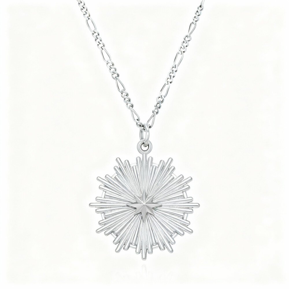 Radiate refined elegance with the Misty Medallion Necklace in White Gold Vermeil. Part of our Classic Collection, this design seamlessly fuses classic and modern styles through its varied medallion motifs. The necklace showcases a subtle sunburst pattern on a figaro chain, and you can make it uniquely yours with complimentary engraving on the pendant's reverse side. It's an ideal choice for both everyday wear and special events, making it a perfect addition to your jewelry assortment or a thoughtful gift!
