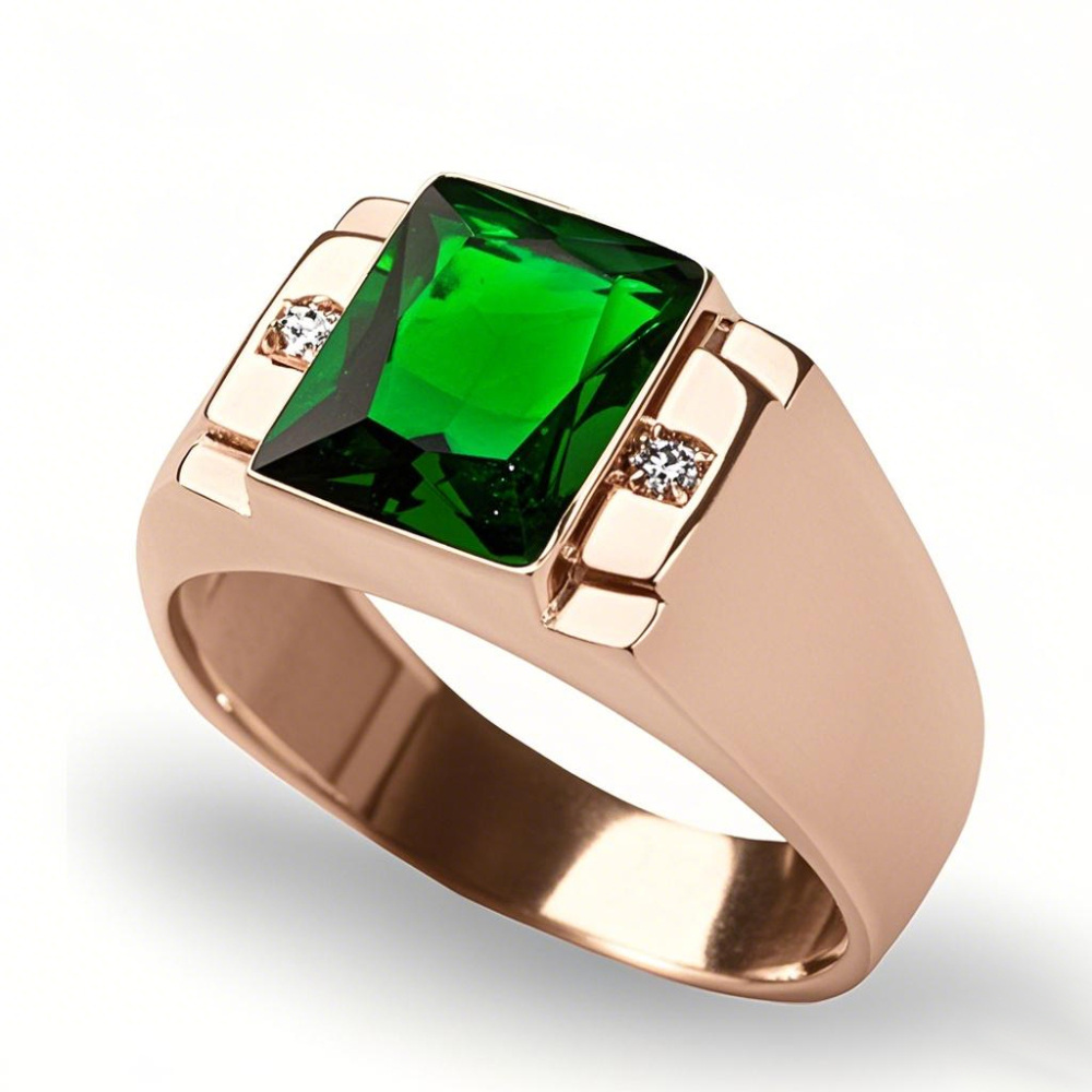 Elevate your style with our exquisite 18K Rose Gold Men's Ring, featuring a stunning three-stone design that highlights a large lab-created emerald at its center, flanked by dazzling lab-created diamonds. With exceptional polish, cut, and symmetry, this elegant ring not only showcases the highest diamond quality (D color and VVS clarity) but also makes a bold statement for any occasion, ensuring you stand out with undeniable sophistication and flair.