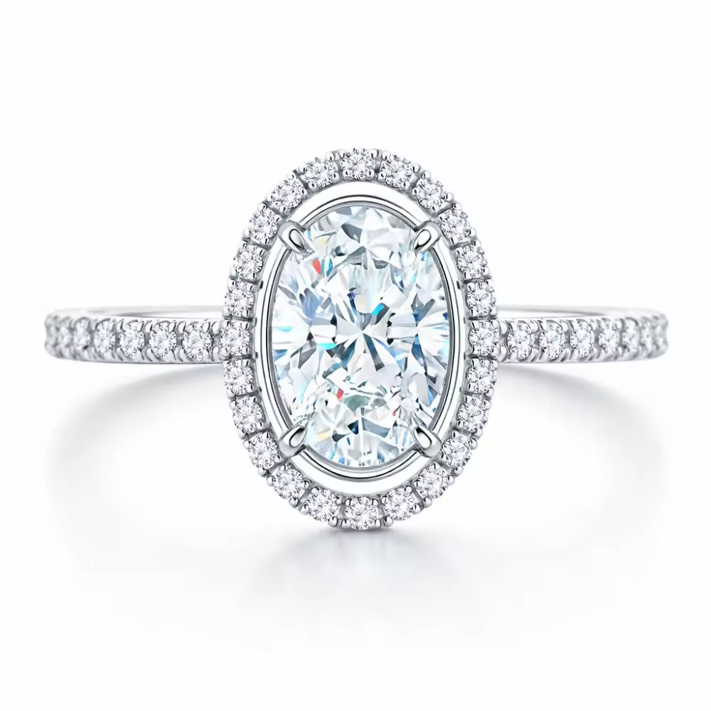 Celebrate eternal love with our 18K white gold halo engagement ring, featuring a brilliant oval moissanite center stone. This masterpiece combines luxury craftsmanship with exceptional fire and brilliance for unforgettable moments.