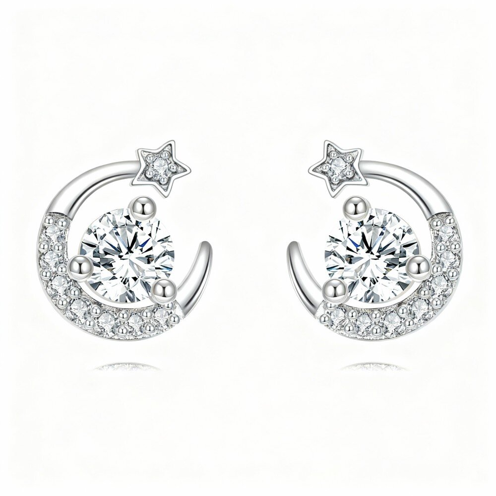 Enhance your elegance with our 9K White Gold stud earrings, adorned with dazzling moissanite moon and star designs. Perfect for adding celestial charm to any outfit.